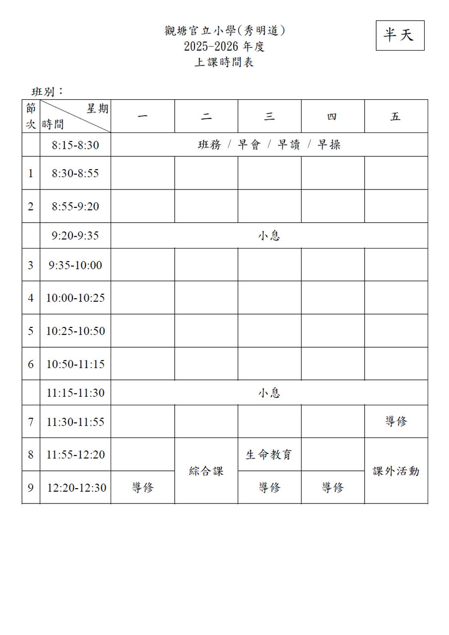 半日上課時間表